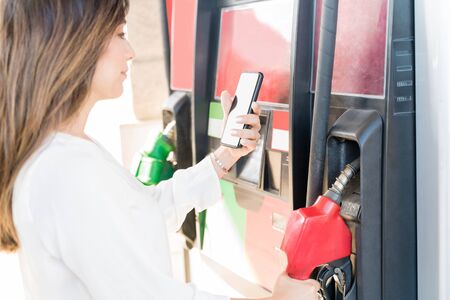 Cropped view of woman holding smartphone and credit card while refueling car on gas station