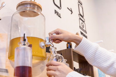A person holds a reusable glass bottle under a tap, refilling it with a golden liquid like oil or vinegar at a zero-waste store. This action promotes an eco-friendly and sustainable lifestyle by reducing plastic waste through bulk purchasing.