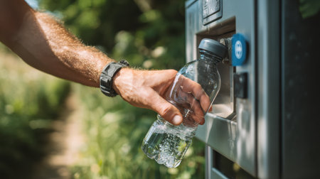 Hand Filling Reusable Water Bottle at Public Filling Station in Natural Outdoor Setting Surrounded by Greenery and Nature's Beauty