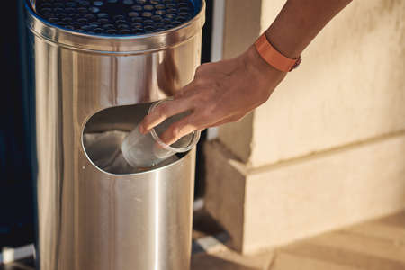 Man hand throwing plastic bottle into special recycling bin. Waste sorting container