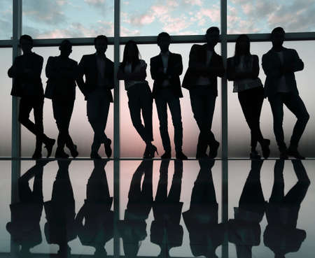 Group of business people standing in front of wide panaramic office windows. Silhouettes of different groups of businesspeople talking with each other in skyscraper office interior