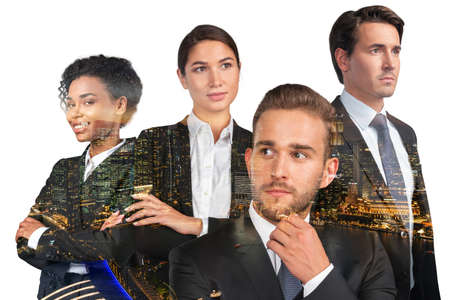 Group of four business colleagues in suits working and dreaming about new career opportunities after MBA graduation. Concept of multinational corporate team. Kuala Lumpur. Double exposure.