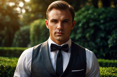 Portrait of confident businessman young guy in vest and bow tie posing at greenery park, strong look. Serious fashionable stylish man in tuxedo, luxury image James Bond style. Copy ad text space