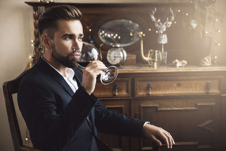 Handsome bearded man with a glass of red wine