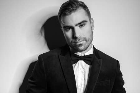 cool black and white picture of sexy elegant businessman in black tuxedo with bowtie looking to side and crossing arms, holding hand in a fashion pose in studio