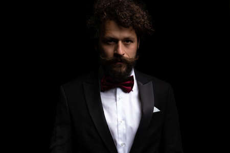 portrait of man in tuxedo bow tie. bride groom in formalwear on black background. formal fashion.