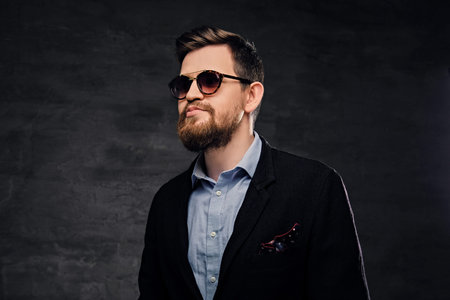 An elegant bearded male dressed in cotton velvet suit and sunglasses over grey background.