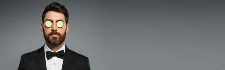 bearded man in tuxedo with fresh sliced cucumber on eyes isolated on grey, banner