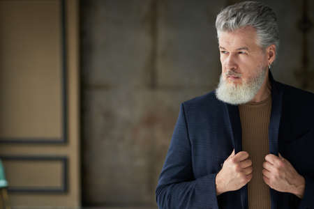 Stylish serious handsome middle aged man looking away, adjusting his suit while posing indoors
