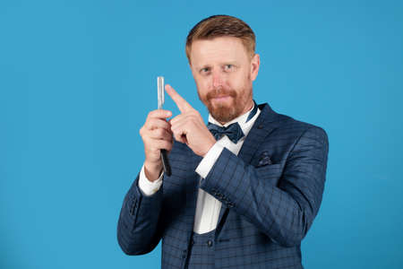 Funny barber. Barber blade. Man with vintage razor.
