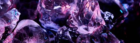 panoramic shot of transparent ice cubes with purple colorful lighting isolated on black