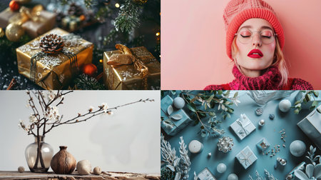 A multi-image collage showcasing festive gift wrapping, holiday decor, cozy fashion, and natural floral arrangements, representing seasonal themes and celebrations.