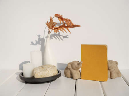 Greeting card mockup,stone podium wedding stationery invitation craft envelope, Philodendron dried leaf vase,candles on white wooden table room interior background with long shadow