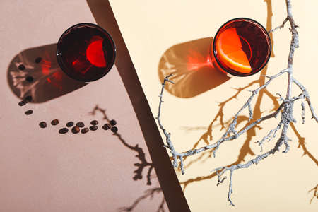 Glasses of tasty cocktails with coffee beans and tree branch on color background