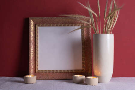 white vase with ears, candles are burning, gold frame for a photo on a red background on the table