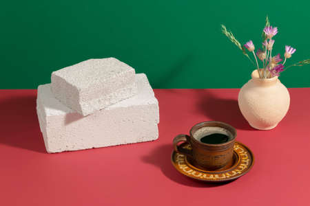 White coffee cup and vase of dry flower on mint green table. pink wall background