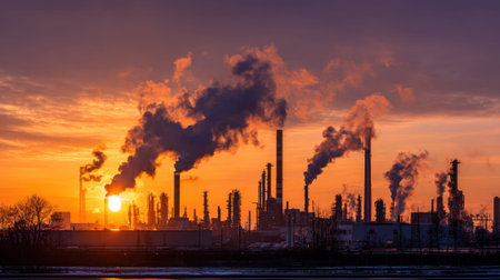 A captivating industrial scene featuring an oil refinery silhouetted against a vibrant sunset. Smoke billows into the sky, highlighting energy production.