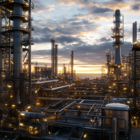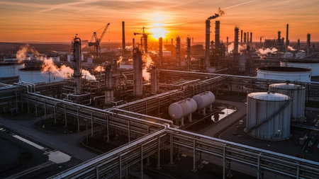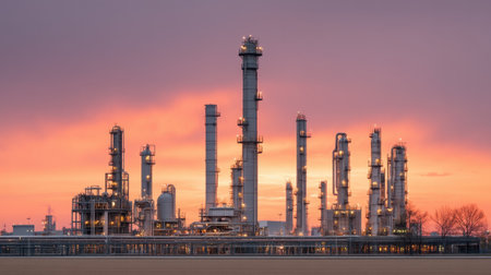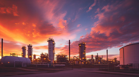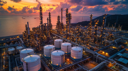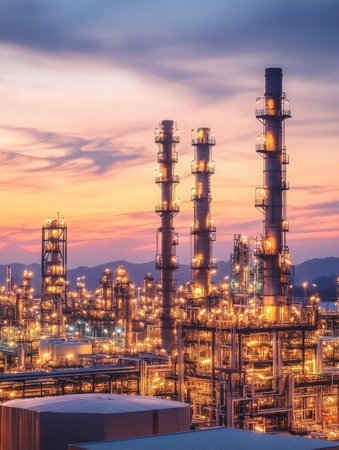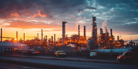 Captivating industrial landscape featuring a refinery at sunset, showcasing smokestacks and illuminated structures against a dramatic sky.