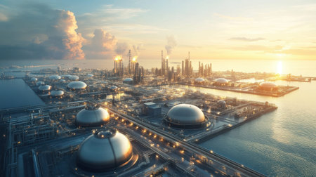 A stunning aerial view captures an industrial oil refinery at sunset, featuring storage tanks and dramatic clouds over the calm water, showcasing technology and energy production.
