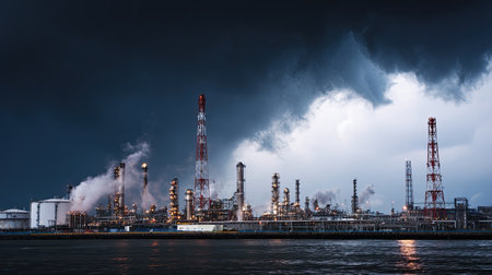 A striking industrial scene of an oil refinery beneath dynamic storm clouds, showcasing towering structures, smoke, and steam, exemplifying energy production.