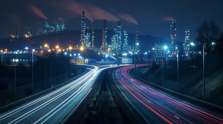 The night sky is aglow with the colorful light trails of cars passing through this industrial park contrasting against the stark silhouettes of the factories