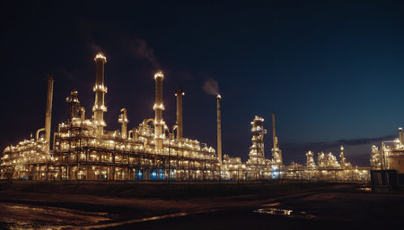 A night scene of an industrial plant, with glowing lights tracing the intricate maze of pipes and towers