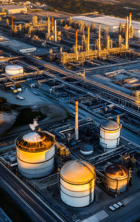This aerial image captures an industrial complex at sunset, showcasing oil storage tanks, a refinery, and city lights in the background, highlighting urban development.