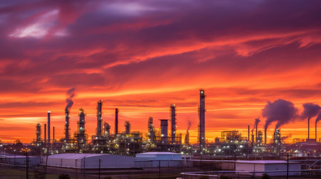 A captivating industrial scene featuring an oil refinery silhouetted against a vibrant sunset. Smoke billows into the sky, highlighting energy production.