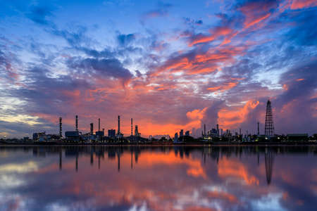 Oil refinery and gas industry at sunrise with reflection over the river