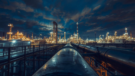 Industrial oil refinery illuminated at night with pipelines in foreground and factory structures