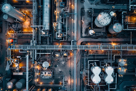 An aerial view of a bustling industrial complex, showcasing interconnected pipes and structures illuminated at night. This image represents the modern integration of technology and manufacturing,