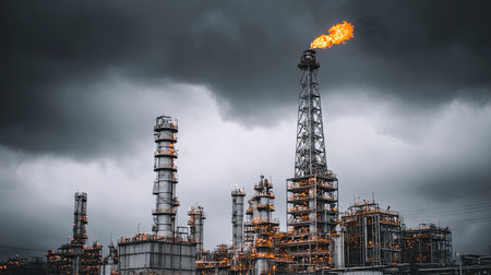 A striking view of an industrial oil refinery at night, featuring flames shooting from a tower against a backdrop of dark clouds and moody lighting.