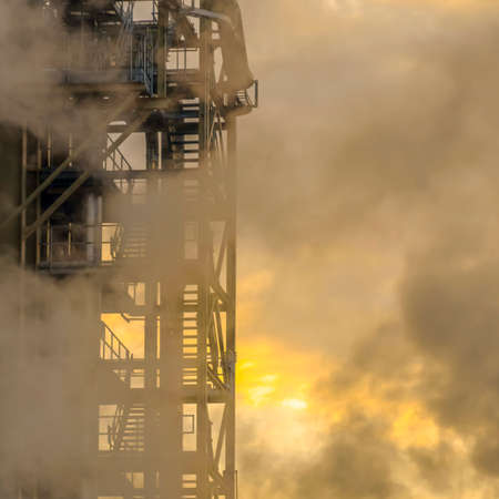 Staircase of Power Plant veiled with steam in Utah. Staircase of a Power Plant in Utah Valley against cloudy sky at sunset. The flight of stairs is veiled with steam emitted by the Power Plant.