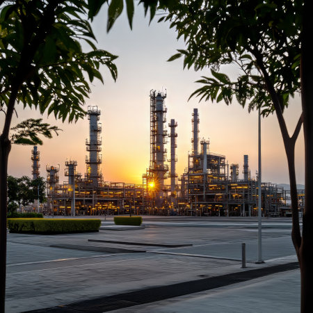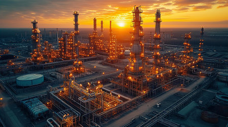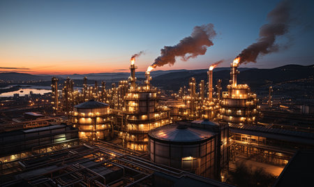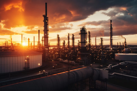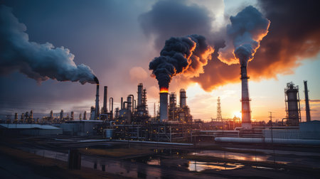 A captivating industrial scene featuring an oil refinery silhouetted against a vibrant sunset. Smoke billows into the sky, highlighting energy production.