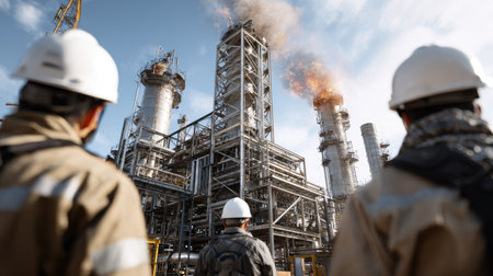 Two workers in safety helmets and gear observe the operation of an industrial facility with flames and smoke, highlighting energy production activities.