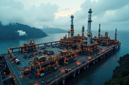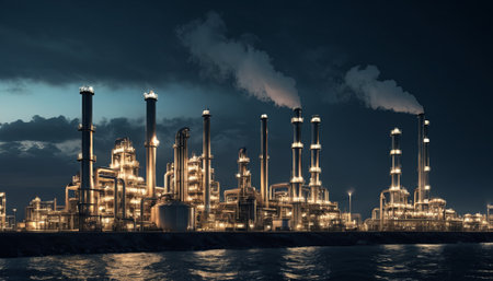 The oil refinery comes alive at night with glowing industrial lights highlighting its towering structures against a moody sky.