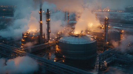 Dive into the heart of industrial operations with this detailed aerial view of a facility featuring large storage tanks and intricate machinery at night.
