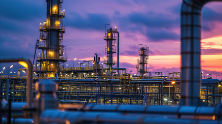 An industrial plant's silhouette emerges against a twilight sky, the intricate network of pipes and structures highlighted by the fading light.