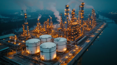 An aerial perspective capturing the intricate structures of industrial oil storage tanks and refineries at dusk, showcasing urban energy production.