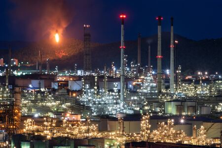 pipelines and towers of oil and gas refinery petrochemical factory at night, petroleum and chemical plant