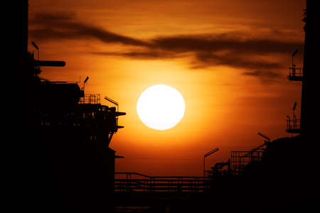 Close up of the sun during sunset in the evening twilight between 2 oil refinery buildings