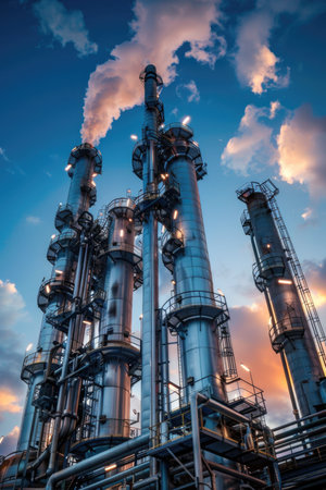 A stunning industrial landscape showcasing refineries against a colorful dusk sky. Emissions rise from tall smokestacks, reflecting on the water below.