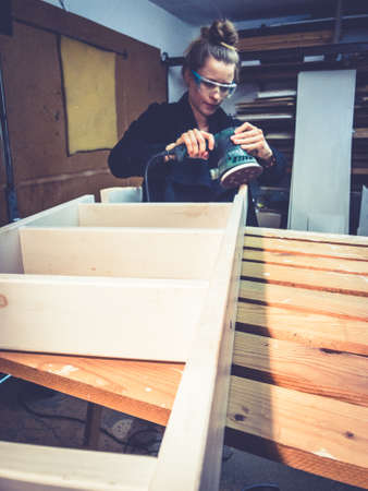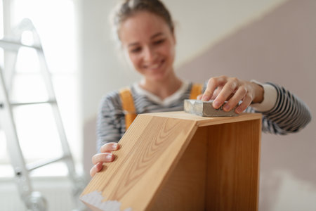 Portrait of young woman remaking shelf in her new flat. Concept of reusing materials and sustainable lifestyle.