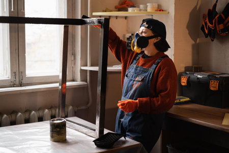 Woman general worker painting industrial style metal table frame with brush home DIY project