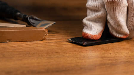 Carpenter master with gloves grouting wooden parquet, phase after sanding. Varnishing of oak parquet floor, man workers with hand and spatula