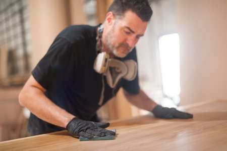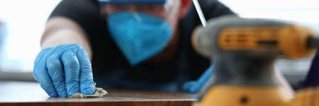 Carpenter works with tree on table, near tool. Builder polishes sander wooden surface. On desktop lies builder tool and sander machine. Carpenter in gloves cleans polished wooden surface