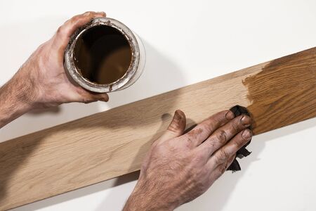 Top view of woodworker applying wood stain on board near jar in workshop