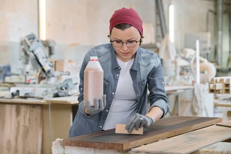 Middle-aged craftswoman working in woodworking workshop. Female varnishing wooden board with oil, varnish. Furniture joinery wood business.