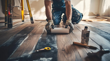 A worker kneeling while rolling primer onto a wooden floor, surrounded by tools and materials for renovation