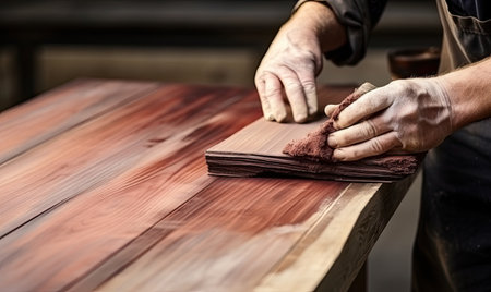 Man covering wooden tabletop with oil closeup
